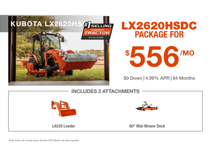Only $394 per month plus tax, with Kubota CIR Rebate – using 4.99% int. for 84 mo.